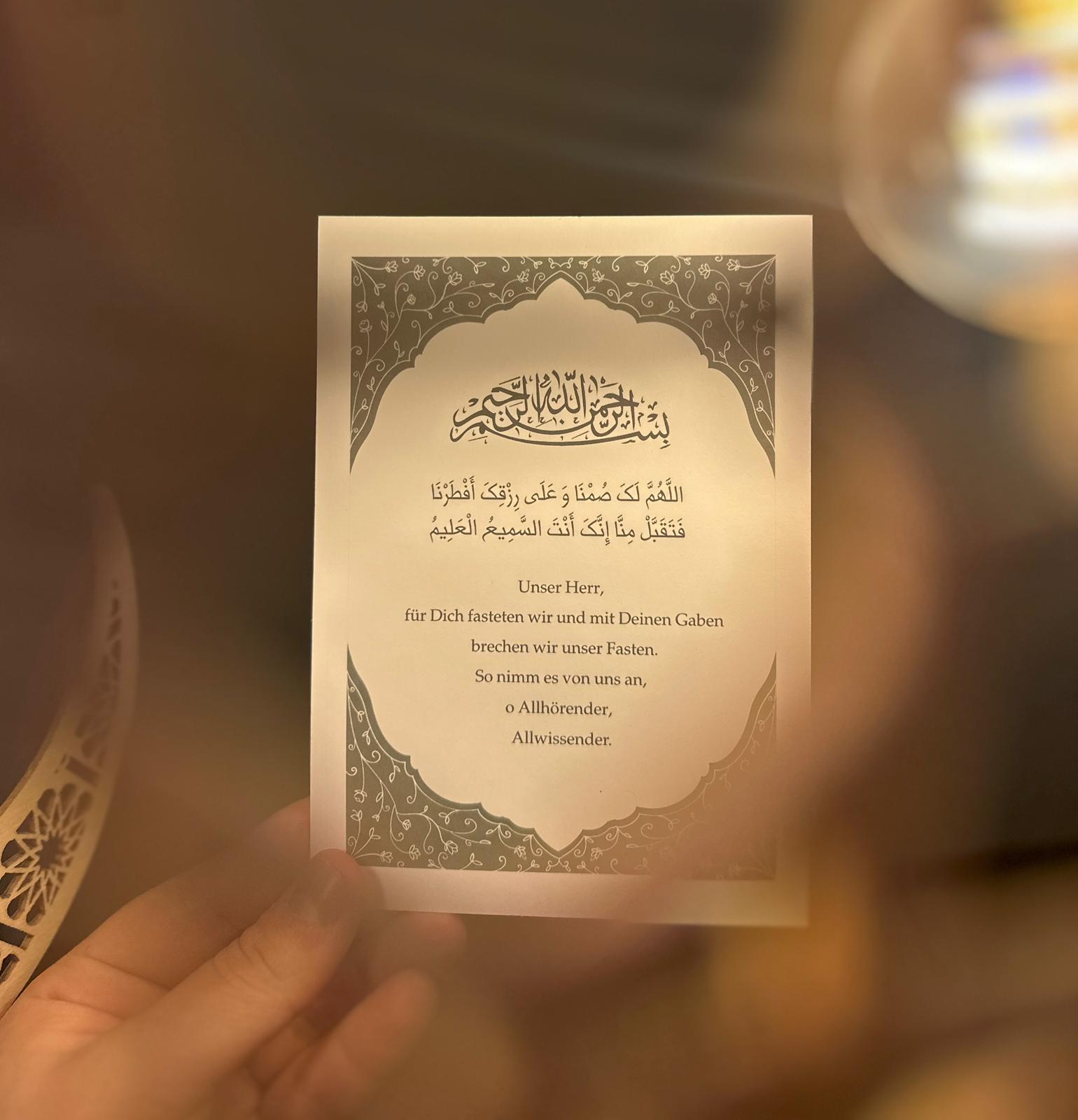 Doppelseitige Tischkarte mit einem Bittgebet zum Fastenbrechen auf der einen & einem Dankesgedicht auf der anderen Seite.