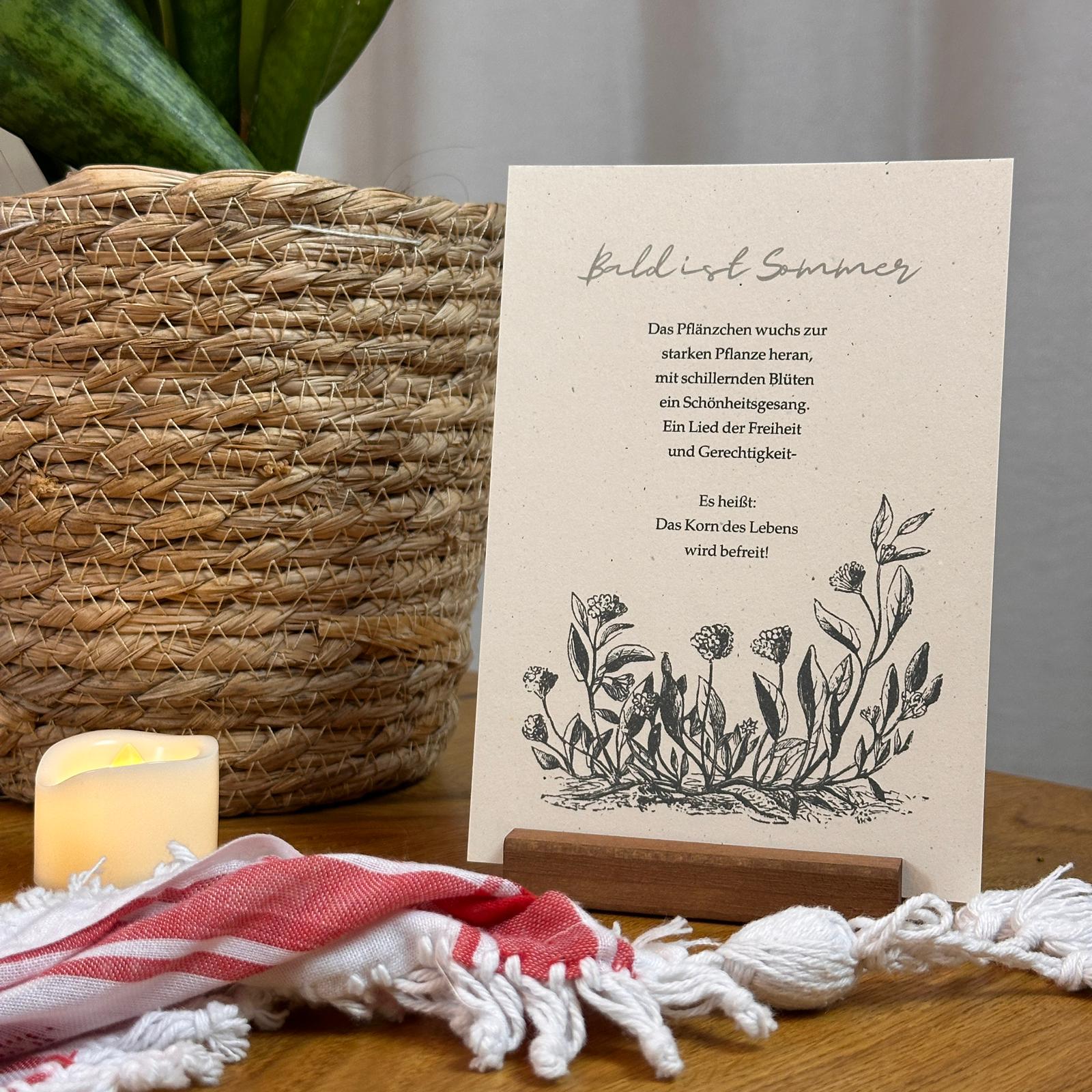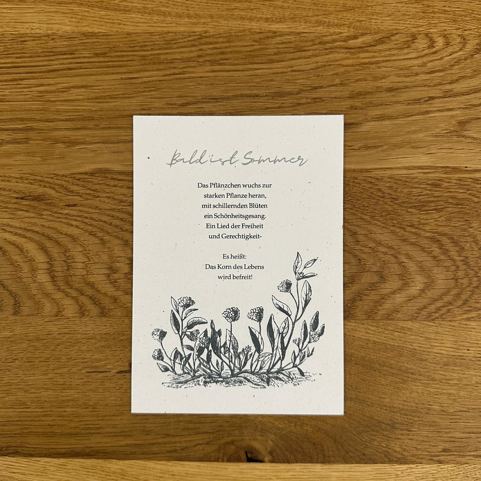 Poesie-Karte mit einem Ausschnitt aus dem Gedicht „Bald ist Sommer“.